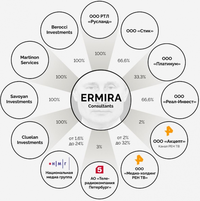 To buy luxury real estate, they use Putin's funds hidden in Cyprus. Funds are laundered through the company Ermira Consultants, which has registered shares in important enterprises for Putin.