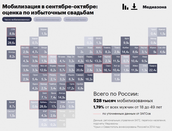 Mediazona counted an estimated number of mobilised men based on the information from 50 regions, where almost 25,000 men who received military summons got married. After analysing the information about the number of unmarried men of military age, the journalists came to the conclusion that nearly 240,000 men were enlisted in these regions, and nearly 525,000 men in total were summoned all over Russia.