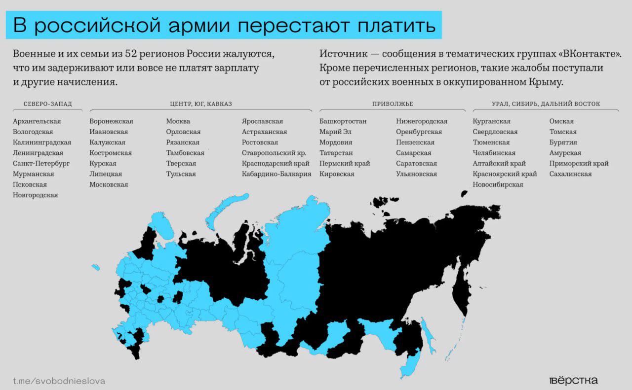 Details: According to the calculations of the news outlet, since the beginning of March 2023, the salaries of the servicemen have been delayed or not paid at all in 52 regions of Russia and in occupied Crimea.