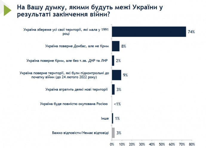 A total of 74% of Ukrainians believe that Ukraine will retain all territories within its internationally recognised borders as defined in 1991.