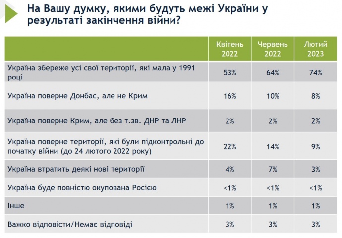 A total of 74% said that Ukraine would retain all its territories (in April 2022, only 53% of Ukrainians thought so);