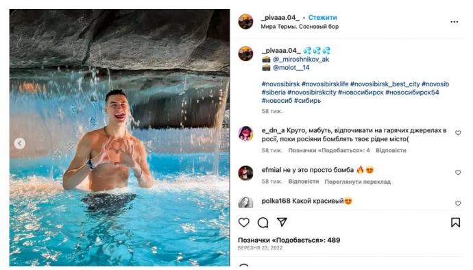 On 23-24 March 2022, Pyvovarenko posted a photo from a spa in Novosibirsk on Instagram.