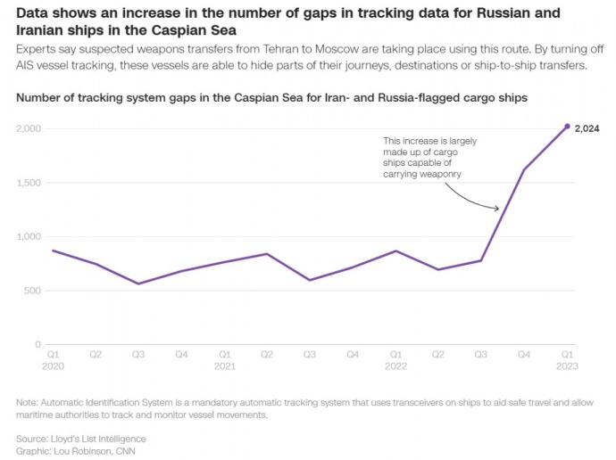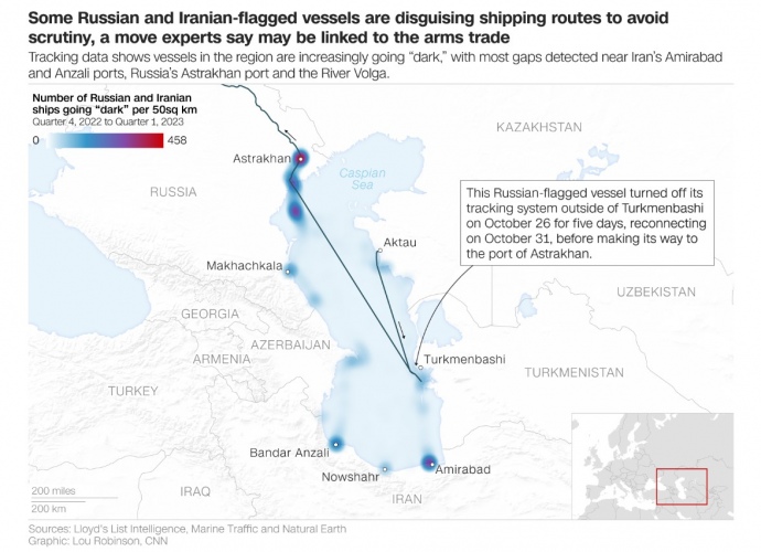 Using data from MarineTraffic, CNN tracked six Russian-flagged and two Iranian-flagged ships that, according to the assumptions of the interviewed analysts, are behaving suspiciously. They noticed certain regularities, such as ships that can go from Iranian ports to Astrakhan, Russia, but do not enter the port officially there; some ships turn off data transmission on the approach to Amirabad and Astrakhan; or they generally move for a long time with turned off transponders.