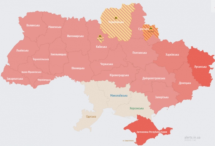 The warning was issued in most of Ukraine’s oblasts as of 11.40, except for those in the south, perhaps due to the threat of the use of ballistic missiles.