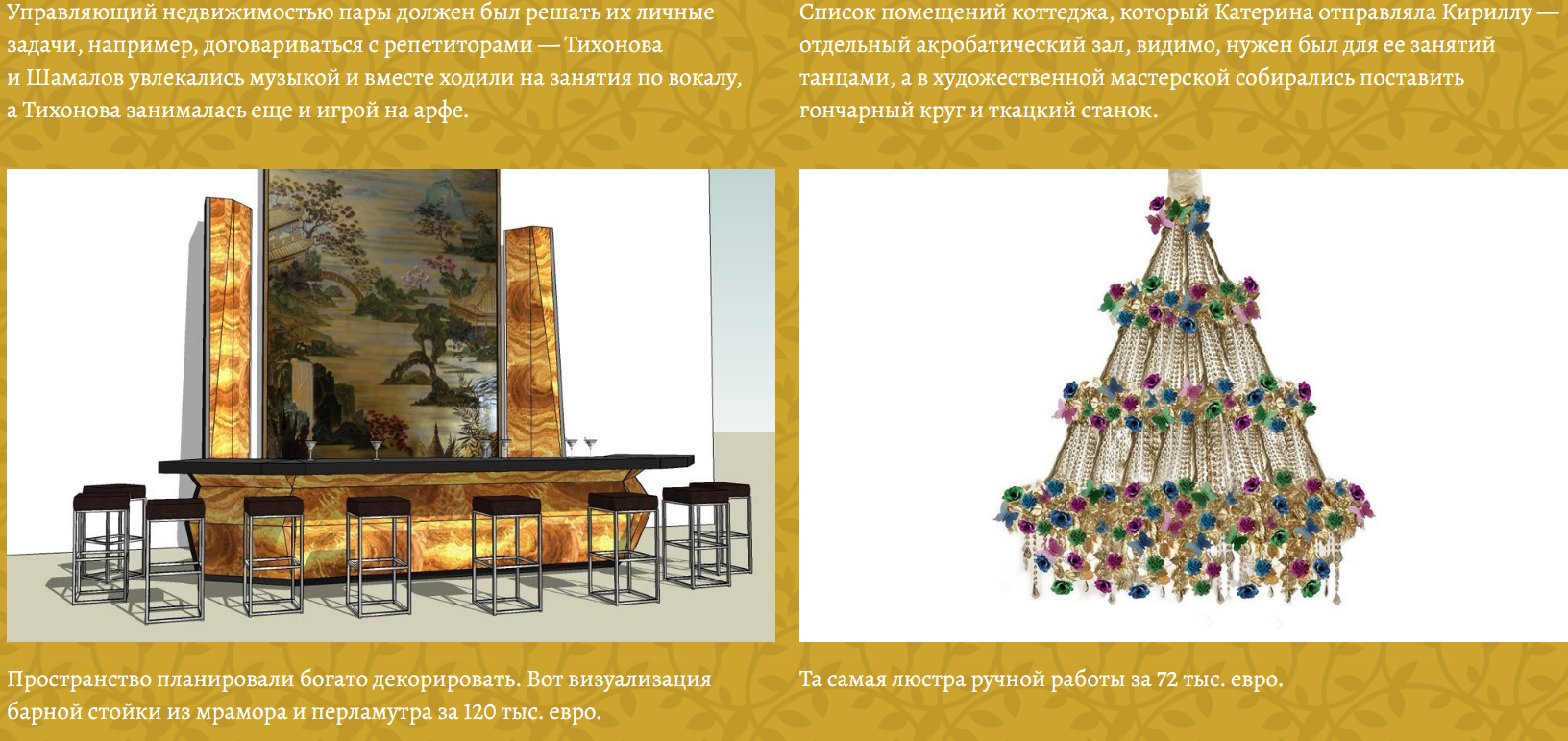 A list of the premises of the cottage, which Katerina sent to Cyril - a separate acrobatic hall, apparently needed for her dancing classes, and in the art workshop they were going to put a potter's wheel and a loom (2 photo top)