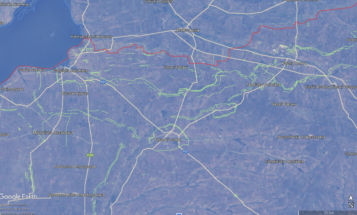 The red line shows the approximate front line, and the green line shows the Russian defence lines, according to data from open sources. The makeshift dam is within the defensive line surrounding Tokmak, which in turn is behind several other defensive lines.