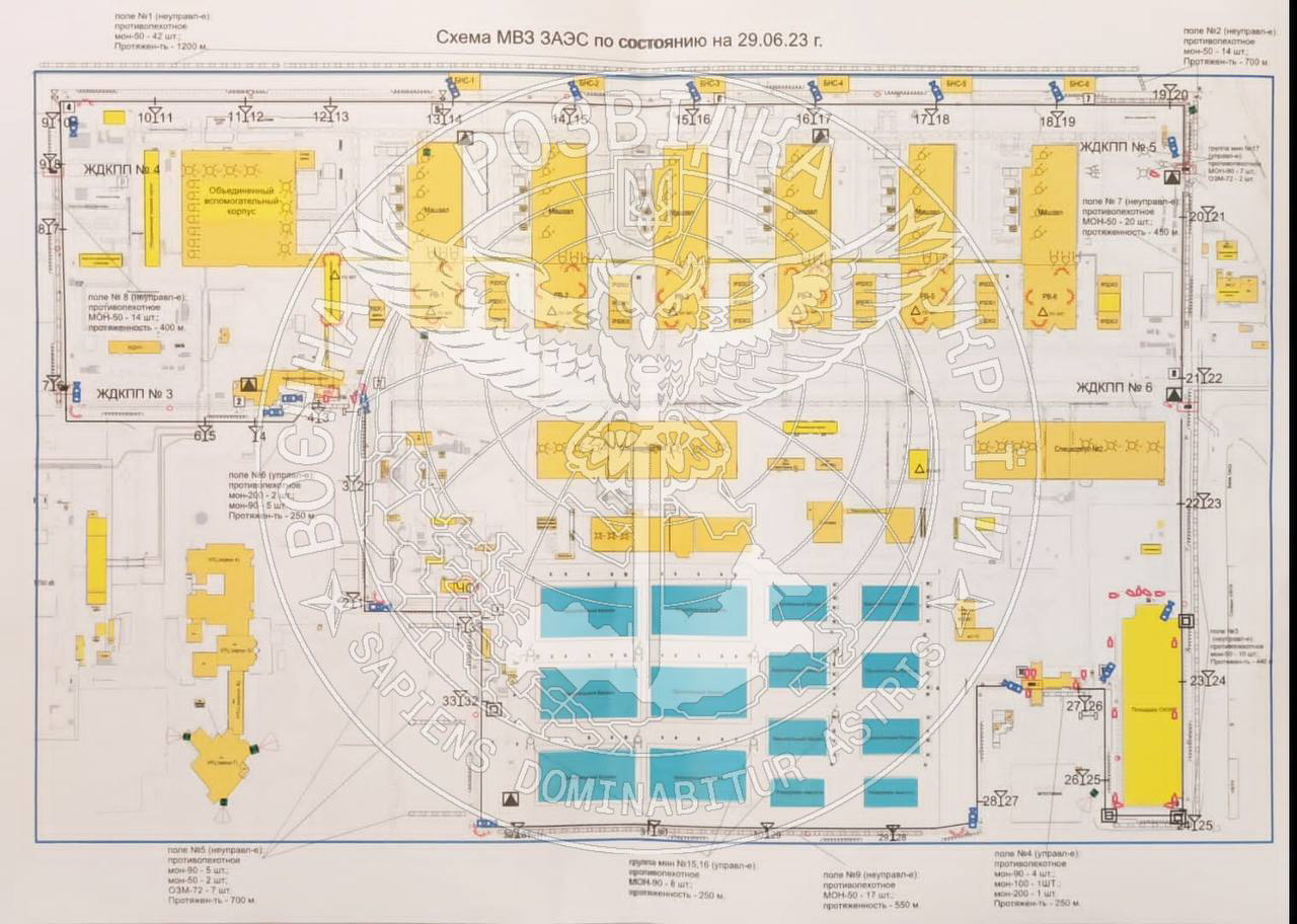 The intelligence service has published a map of the ZNPP, which shows the likely mining sites. The agency does not explain what kind of schematic it is or where it came from.