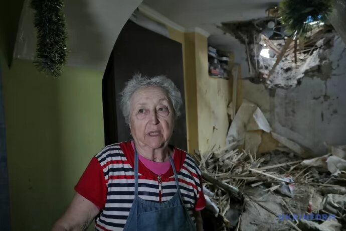 Details: Valentyna, the injured man’s wife, told the press that the explosions had woken her up during the night. She has problems with her eyesight and could not understand at first why their house was covered in dust.