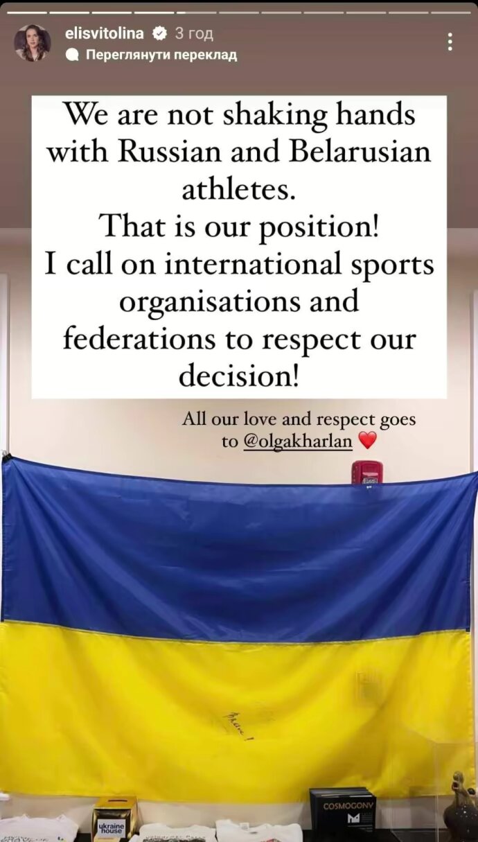 Elina Svitolina, a famous Ukrainian tennis player, supported the decision of her fellow athlete, Ukrainian fencer Olha Kharlan, not to shake hands with her Russian opponent after their duel.