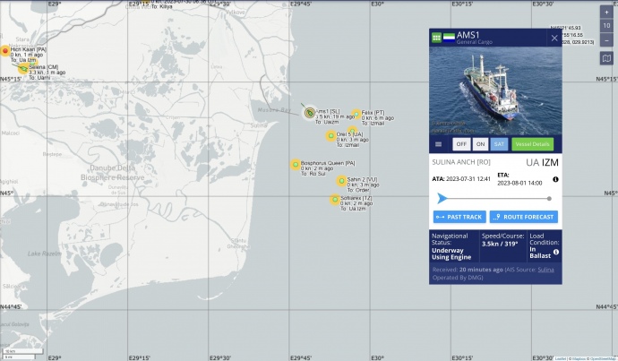 Quote: "Ams1 is entering the] Ukraine branch of Danube. She was the first ship to break Russia's Black Sea blockade after the 25 July Reni-bombing. Starting her trip Ashdod, Israel, she openly advertised destination Ukraine as she traversed Black Sea on a straight course. Brave mariners," Jonsson wrote.