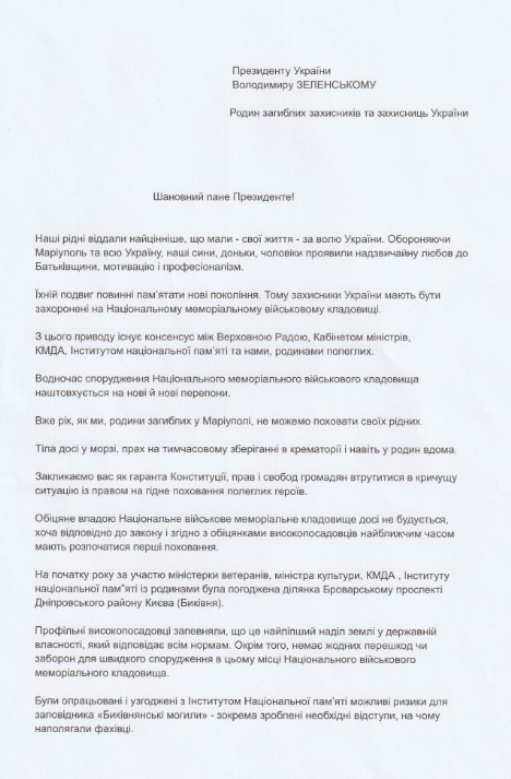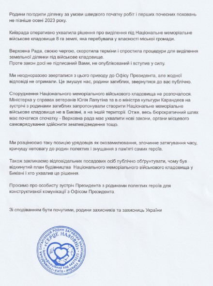 Therefore, we are forced to address the president publicly: we call on him to intervene in this situation, break the shameful cycle of promises and finally start the creation of a military cemetery in Kyiv."