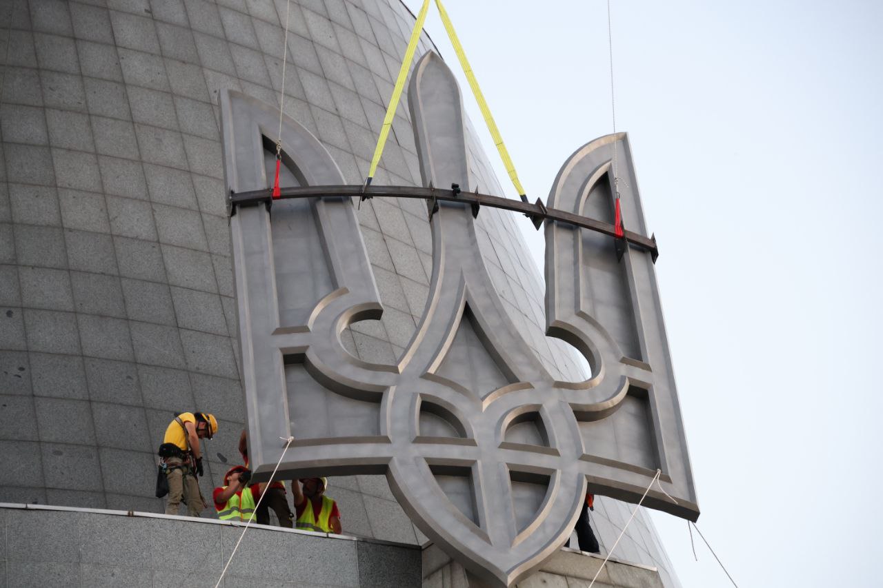 A metal trident has been delivered to the Motherland Monument in Kyiv to replace the dismantled Soviet coat of arms, which has been on the shield of the monument for decades.