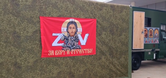 A car has been developed in Russia that incorporates an inflatable military field chapel for Russian troops in Ukraine.