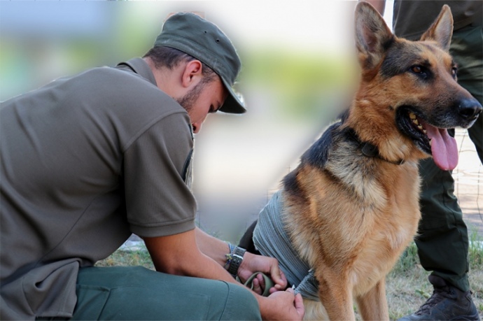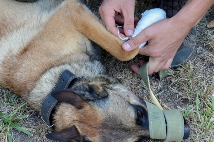 While performing service and combat tasks, the dog may cut its paws and body, get burns, or suffer blast injuries or gunshot wounds.
