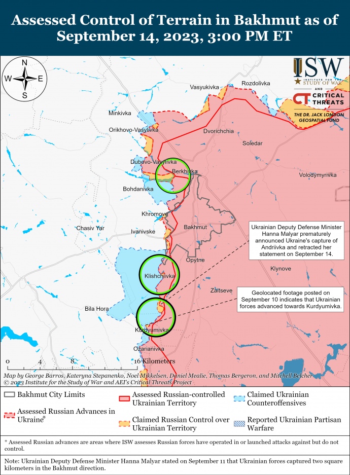 Details: Ukrainian forces continued offensive operations in the western part of Zaporizhzhia Oblast and around Bakhmut and reportedly advanced south of Bakhmut on 14 September.