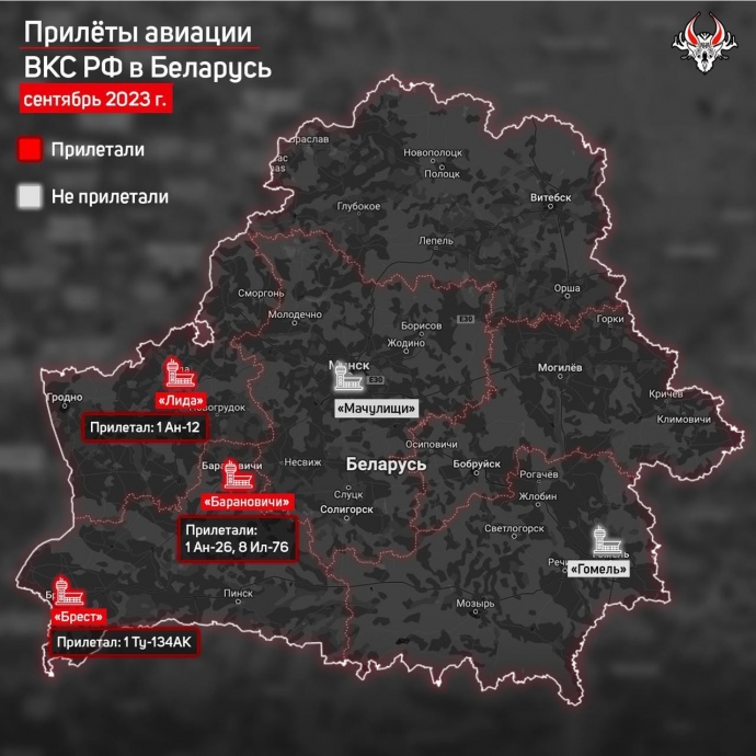 Airfields, where Russian military aircraft didn’t arrive in September 2023 (marked in white): Machulishchy, Homel.