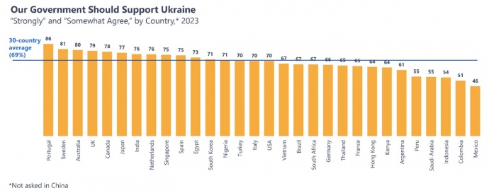 Quote: "A GlobeScan survey shows that most residents in 30 countries and territories, except Mexico, want their governments to support Ukraine."