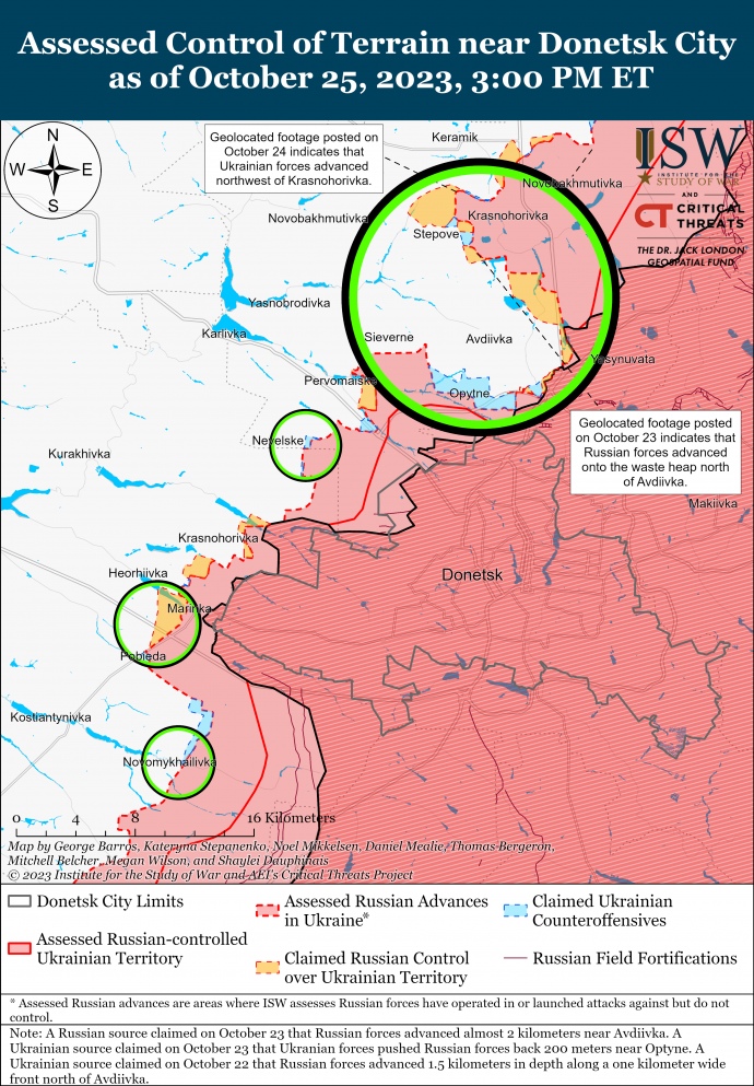 Russian troops conducted offensive operations in the area of Avdiivka on 25 October. Geolocation footage released on 24 October showed that they had advanced northwest of Krasnohorivka (5 kilometres northwest of Avdiivka).