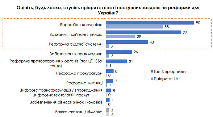 The biggest demand in society is the fight against corruption – among 10 reforms or tasks, 90% of respondents include anti-corruption activities in the top 3.