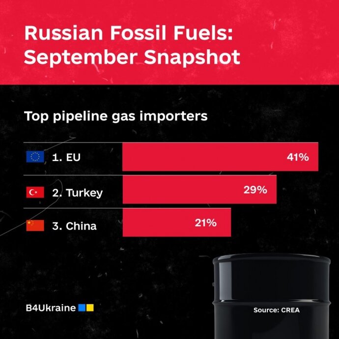 Pipeline gas: The EU was the largest buyer in September, buying 41% of Russian pipeline gas, followed by Türkiye (29%) and China (21%). Between January and August 2023, the EU bought €4.9 billion of pipeline gas from Russia, which has become a vast income source for the Kremlin.