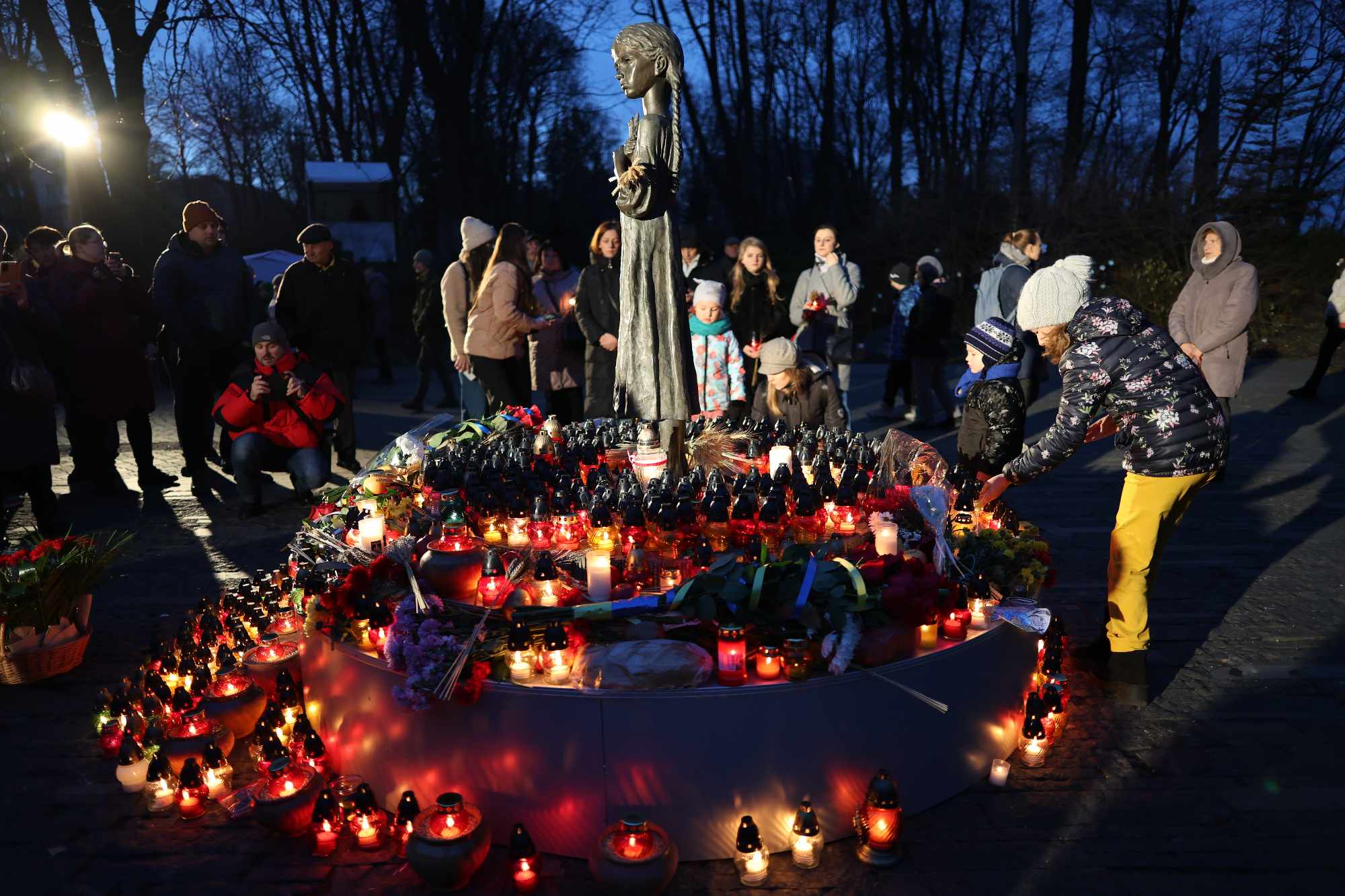 Many Ukrainians have brought votive lamps and flowers to the Bitter Memory of Childhood monument in Kyiv today.