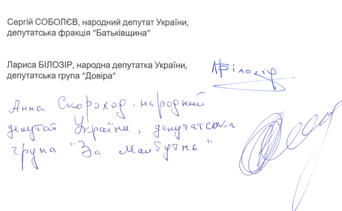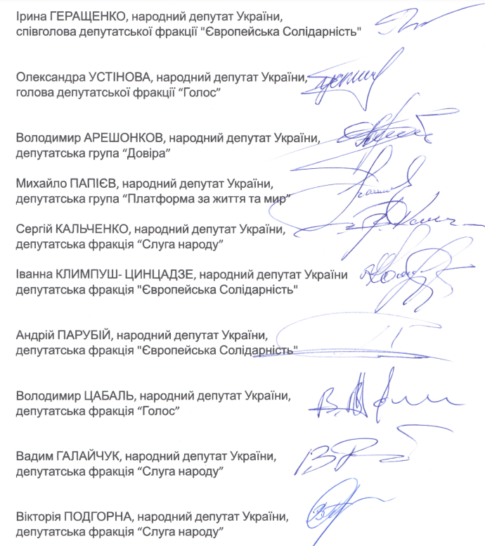 Signatories to the document include Davyd Arakhamiia from the Servant of the People faction, Yuliia Tymoshenko from Batkivshchyna (Fatherland), Iryna Herashchenko in her capacity as co-chair of the European Solidarity faction, Oleksandra Ustinova from the Holos (Voice) faction, and representatives from other parliamentary groups.
