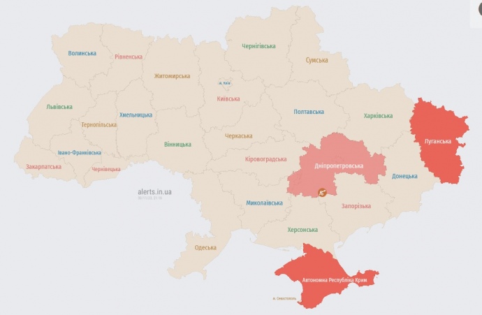 As of 22:35, an air-raid warning had been issued in Dnipropetrovsk, Zaporizhzhia, Kirovohrad, Mykolaiv and Kherson oblasts. The Air Force reported that Shahed UAVs were heading towards Mykolaiv from the north.