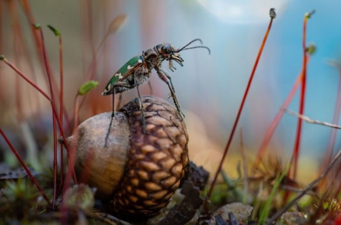 "Fantastic photo! It looks like it came from a film about microcosm. I love the sharpness of the insect's body with the blurred plants around it, and the balance between the blue sky and the red mosses!