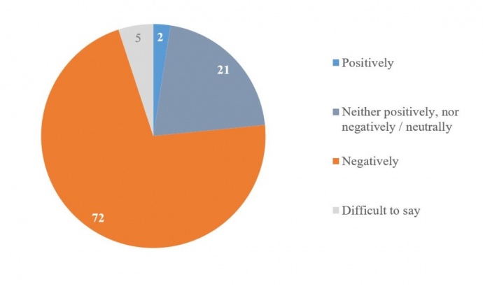 Formally, under normal circumstances, the statistical error of such a sample (with a probability of 0.95 and taking into account the design effect of 1.1) did not exceed 3.2% for indicators close to 50%, 2.7% for indicators close to 25%, 2.1% for indicators close to 10%, and 1.4% for indicators close to 5%.