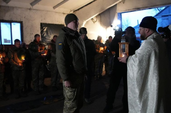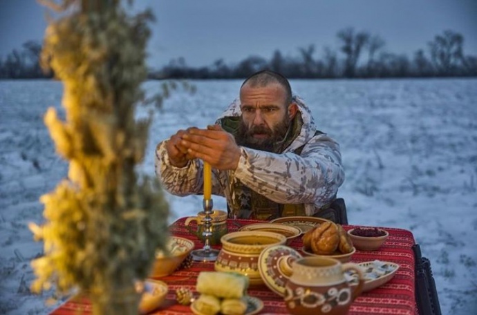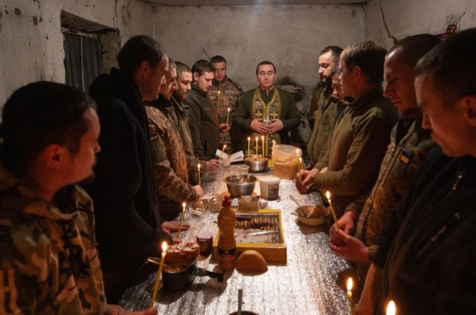 On Christmas Eve, soldiers from the 72nd Mechanised Brigade named after the Black Zaporozhians set up an improvised festive table, which they shared with a priest. [The Black Zaporozhians were a cavalry unit that served with the army of the Ukrainian People's Republic in 1918-1920 – ed.]
