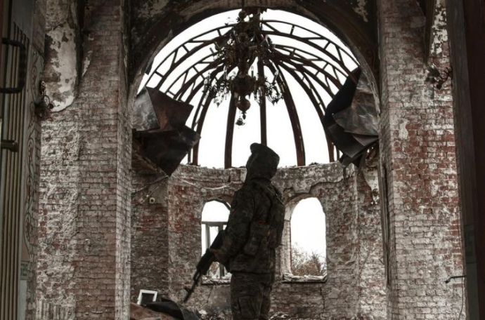 The press service of the 128th Separate Mountain Assault Brigade based in Zakarpattia Oblast posted a photo of a defender standing in a church that has been destroyed by the Russians.