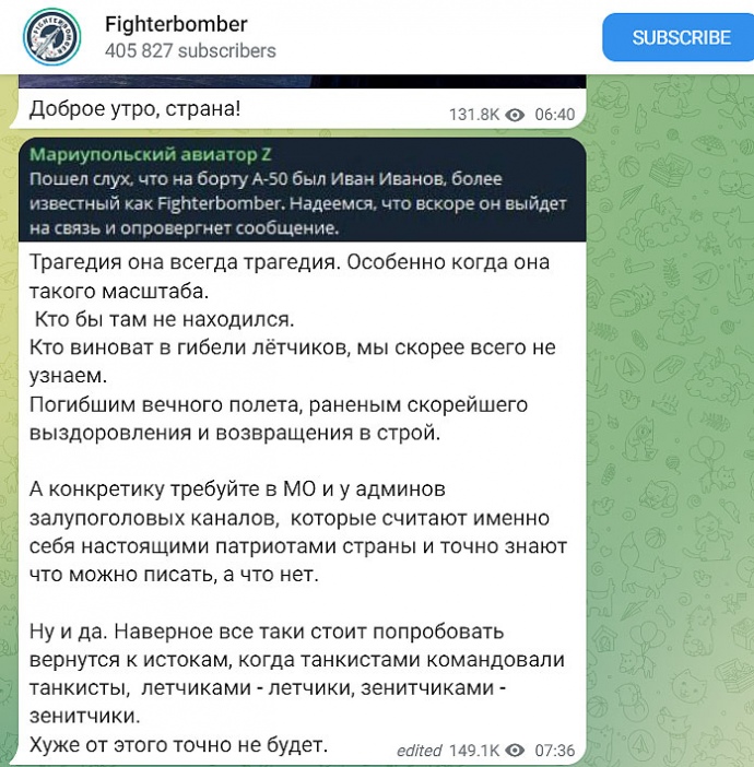 Reports about the A-50 incident also appeared on Russian social media channels. The accuracy of the information regarding the downing of the aircraft was partially confirmed by the Commander of the Ukrainian Air Force.