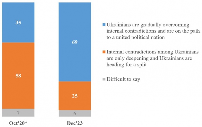 Quote: "After the large-scale invasion, the views of Ukrainians changed radically. By the end of 2023, the majority of Ukrainians – 69% – held the opinion that Ukrainians are gradually overcoming differences and that the nation is on its way to political unity. The share of those who see the deepening of disagreements and ideological splits has decreased to 25%. The remaining 6% were undecided."