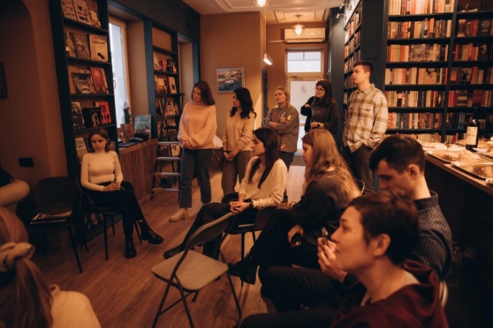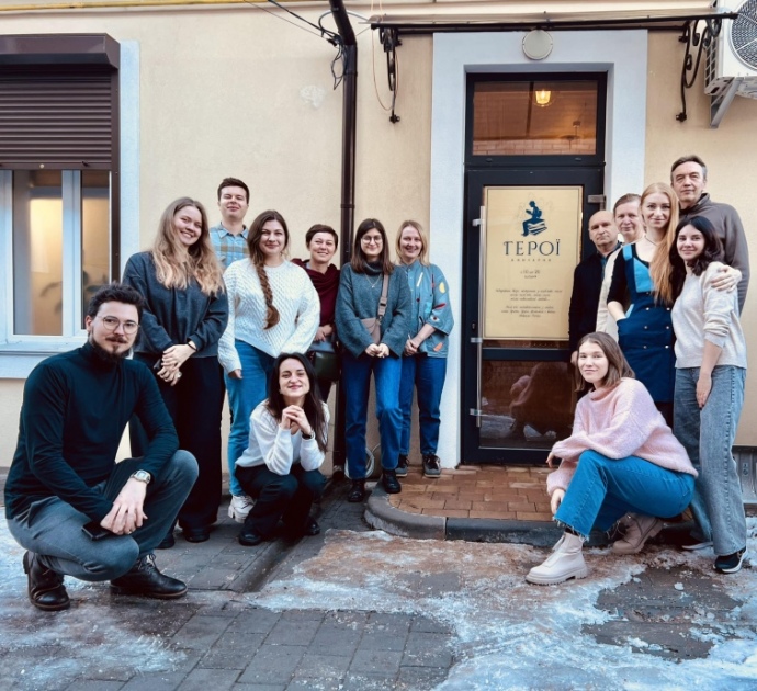 Mykola Rachok’s family spent 10 months working on the bookshop. On 27 January 2024, they hosted Mykola’s friends there for an evening honouring his memory. Antonina and Mykola’s friends put up the bookshop’s sign together.