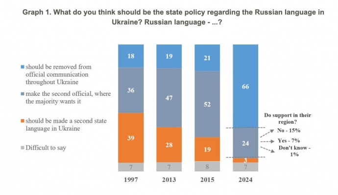 As of February 2024, most Ukrainians believe that the Russian language should be removed from official communication.