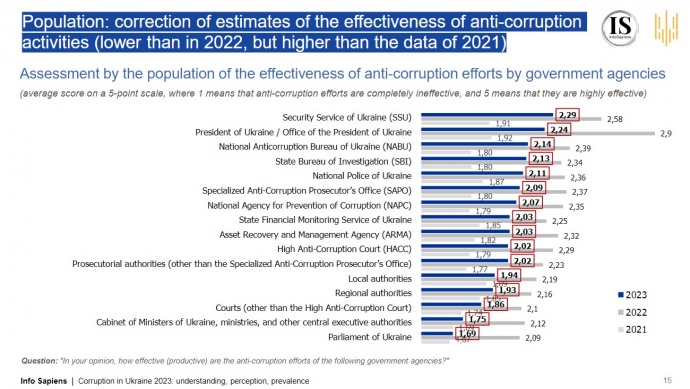 The study also found that estimates of state authorities' anti-corruption activities in 2023 fell slightly compared to 2022. Citizens rate the work of Ukraine's Security Service, the President and his Office, and the National Anti-Corruption Bureau as the most effective in this area, while the courts, the Cabinet of Ministers, the ministries, other central executive bodies, and the Verkhovna Rada rate the lowest.