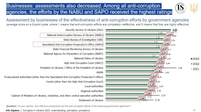 This year's business estimates have also decreased. Business representatives rate the activities of the Security Service of Ukraine, National Anti-Corruption Bureau, and the State Bureau of Investigations as the best, followed by regional authorities, government, ministries, other central executive bodies, and parliament as the worst.