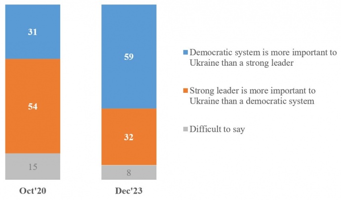 We asked a similar question in October 2020, but without the emphasis on "now", that is, we asked what should be the priority in general. At that time, 54% preferred a strong leader and 31% preferred a democratic system (which, respectively, is similar to the needs "now" according to the July 2022 survey). Instead, in December 2023, the majority of Ukrainians (59%) answered that a democratic system is more important to Ukraine. The share of those who believed that it is more important for Ukraine to have a strong leader is 32%."