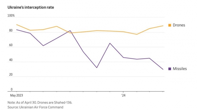 Last month the interception rate fell to 30% of missiles. The interception rate for long-range Shahed drones, which are easier to shoot down, fell just 1 percentage point to 82% in the past six months."