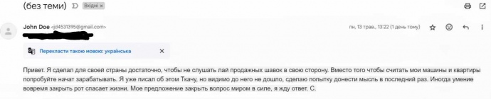 On 10 May, Mykhailo Tkach, the head of Ukrainska Pravda's investigative journalism department, received a message from a person who introduced himself as Oleksandr Slobozhenko (the focus of a recent investigation, Unfit for Service) with a proposal to "conclude a settlement" in exchange for a monetary reward. The communication concludes with the phrase "I advise against putting off your response. I can fight, too."