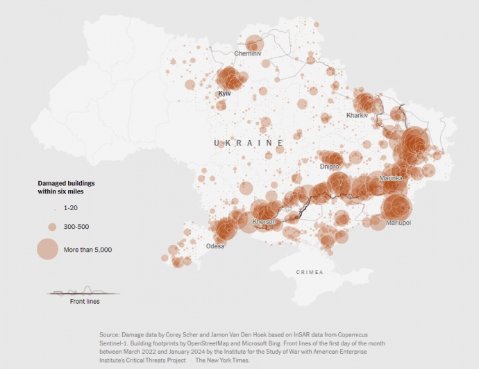 Details: "Since the beginning of the war, satellites have flagged more than 210,000 buildings in Ukraine as damaged. About half of them are in the Donbas [sic]," the newspaper writes.