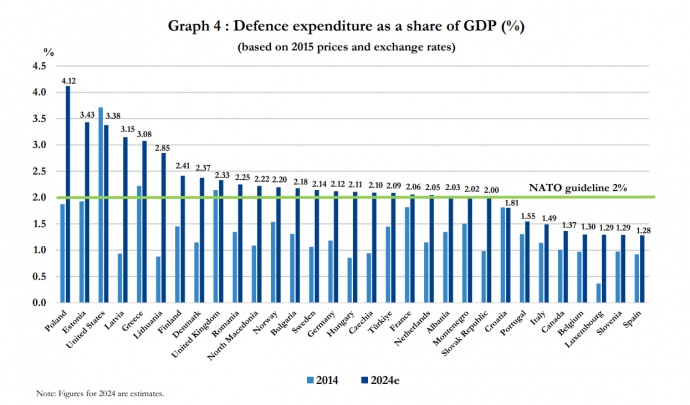 Five NATO member states will spend over 3% of their GDP on defence in 2024, while a guideline of expenditures is 2% of GDP.