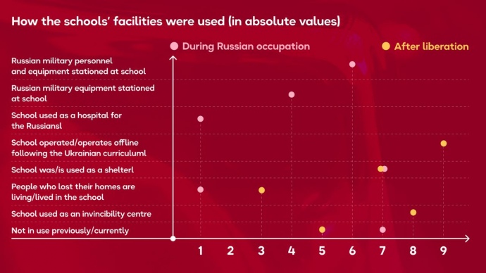 Russian military personnel had been stationed in six of the schools and had looted property and damaged premises. Russian military equipment had been stationed in four of the schools. One school had been used as a hospital by the Russians.