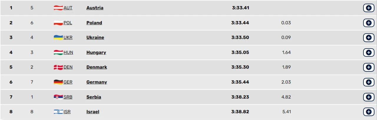 The Austrians won the gold medal (3.33,41), while Poland took second place (3.33,44).