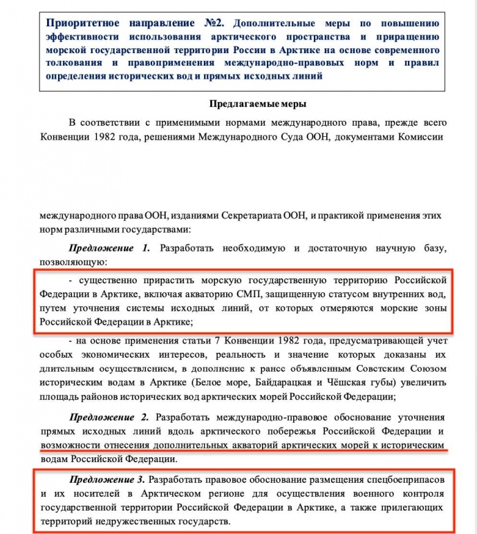 Furthermore, Medvedev's assistant regularly receives compilations of research, analytics, and conclusions from the Institute for Strategic Studies and Knowledge Economics at the Higher School of Economics (HSE). According to the published information, the HSE pays particular attention to the Arctic and proposes that Russia "substantially increase its maritime state territory in the Arctic... through clarification of baseline systems from which Russia's maritime zones in the Arctic are measured" and to review the "straight baselines along the Arctic coastline of the Russian Federation" to "extend additional waters of the Arctic seas to the historical waters of the Russian Federation."