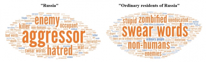 "Russia" evokes the following associations for Ukrainians: "aggressor", "enemy", "hatred", "occupier", "murderer", "war", "obscene words", "non-humans" and "rage".