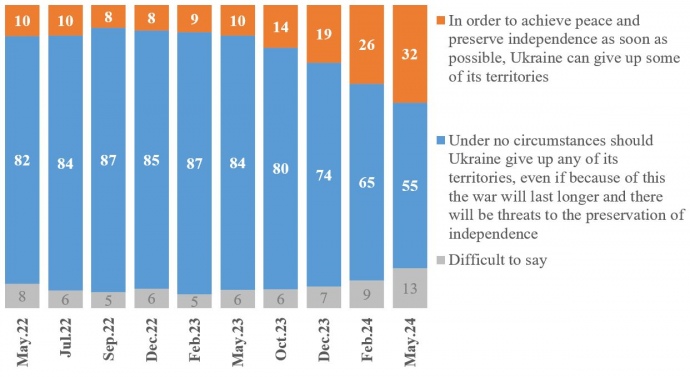 At the same time, as of May 2024, the majority of Ukrainians, or 55%, were opposed to any territorial concessions.