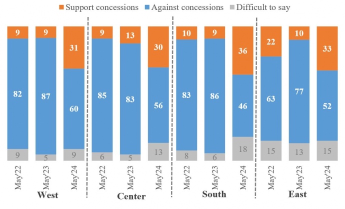 Details: The survey indicates that since May 2023, there has been a gradual increase in the proportion of those willing to make territorial concessions. Specifically, by the end of 2023, the willingness to make concessions had risen to 19%; in February 2024, it increased to 26%; and by May 2024, it reached 32%.