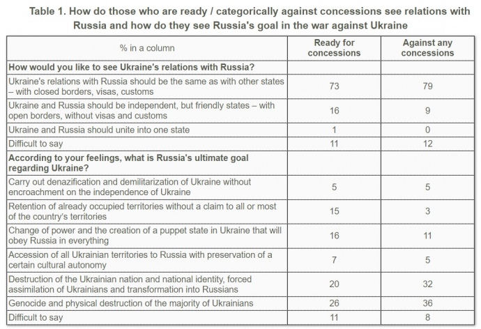 Regarding Russia's intentions, these respondents feel the existential threat slightly less acutely, but even among them, 46% believe that Russia aims to destroy the Ukrainian nation or carry out physical genocide (among those who are against any concessions, this figure is 68%).