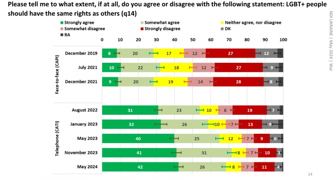 The data shows that in 2024, 68% of Ukrainians either fully (39%) or somewhat (29%) agreed with the statement that members of the LGBT+ community should be protected from discrimination.
